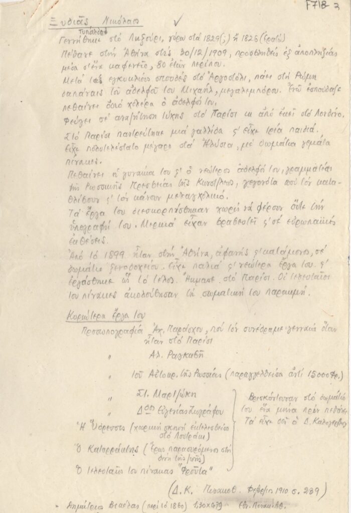 Βιογραφικό, χειρόγραφο με μολύβι, χαρτί, 30×21 εκ., στα ελληνικά, του Νικόλαου Ξυδιά. Περιέχει πληροφορίες για τη ζωή του καλλιτέχνη και την καλλιτεχνική του δραστηριότητα. Ακόμη, λίστα με ορισμένα από τα σημαντικότερα έργα του.