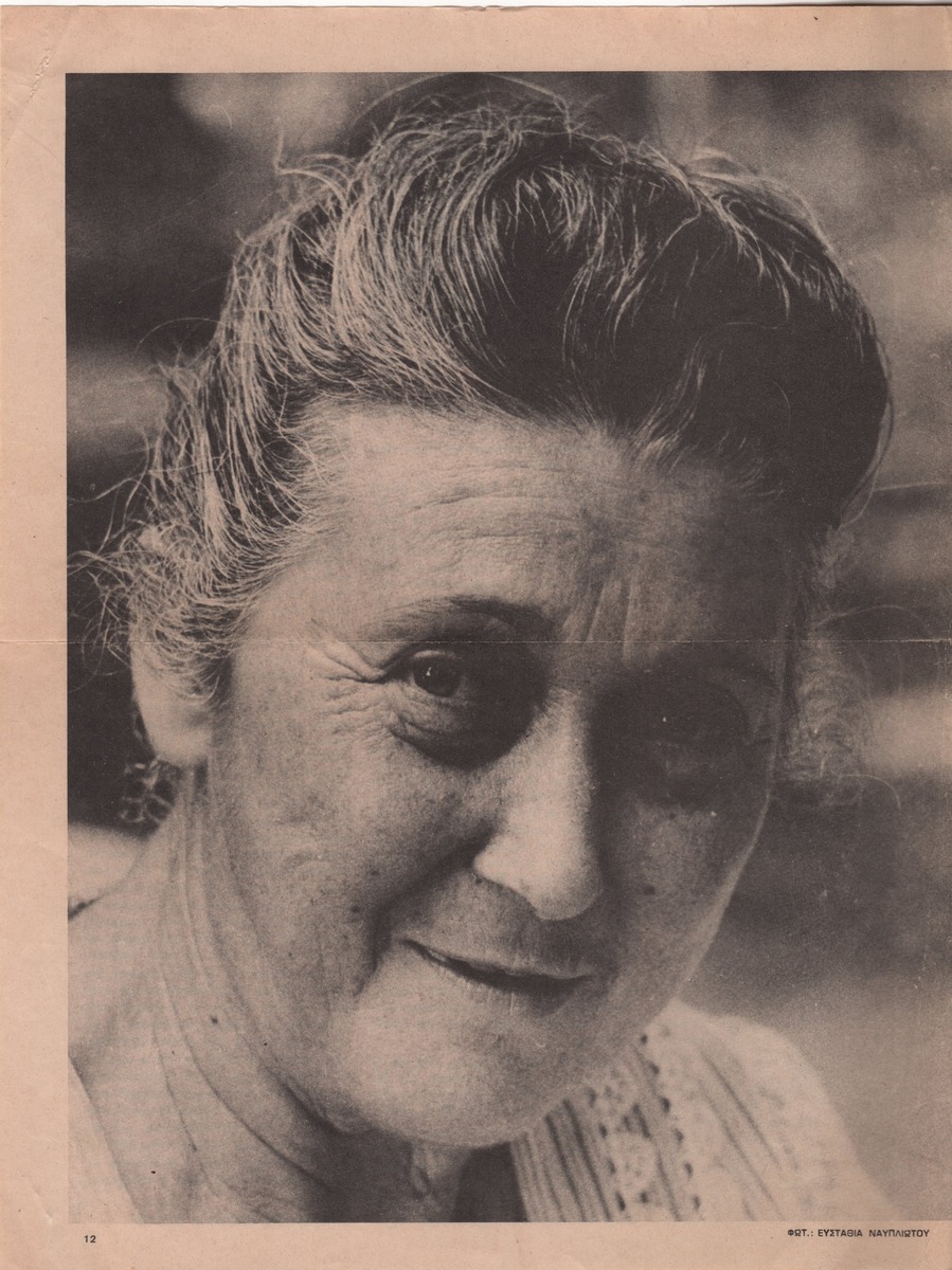 Απόκομμα του περιοδικού “Γυναίκα” (18/08/1976). Συνέντευξη της χαράκτριας Βάσως Κατράκη στην Όλγα Μπακομάρου. Η καλλιτέχνης μιλάει για τα παιδικά της χρόνια, για τις σπουδές, την αντιστασιακή της δράση και το έργο της.