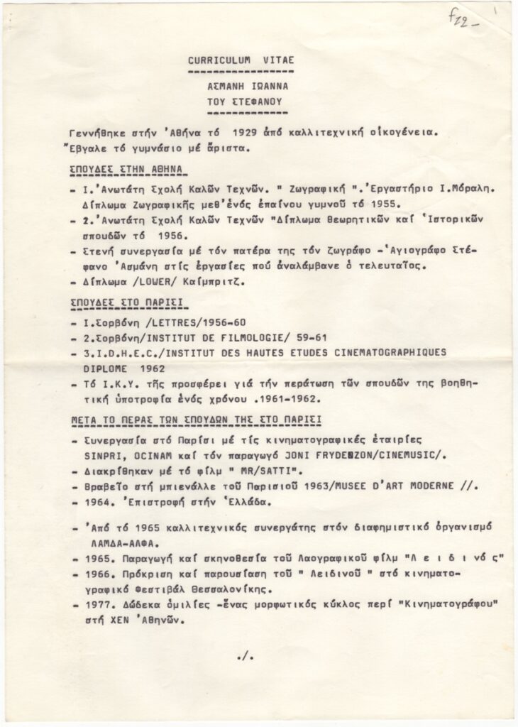 Κείμενο, δακτυλόγραφο, χαρτί, 3 φφ, μίας όψης, 29,7×21,0 εκ., στα ελληνικά. Βιογραφικά στοιχεία για την Ιωάννα Ασμάνη. Περιλαμβάνει σπουδές και κατάλογο ατομικών εκθέσεων και ομαδικών εκθέσεων.