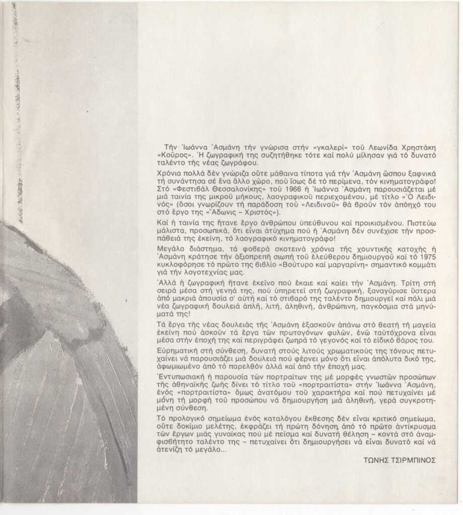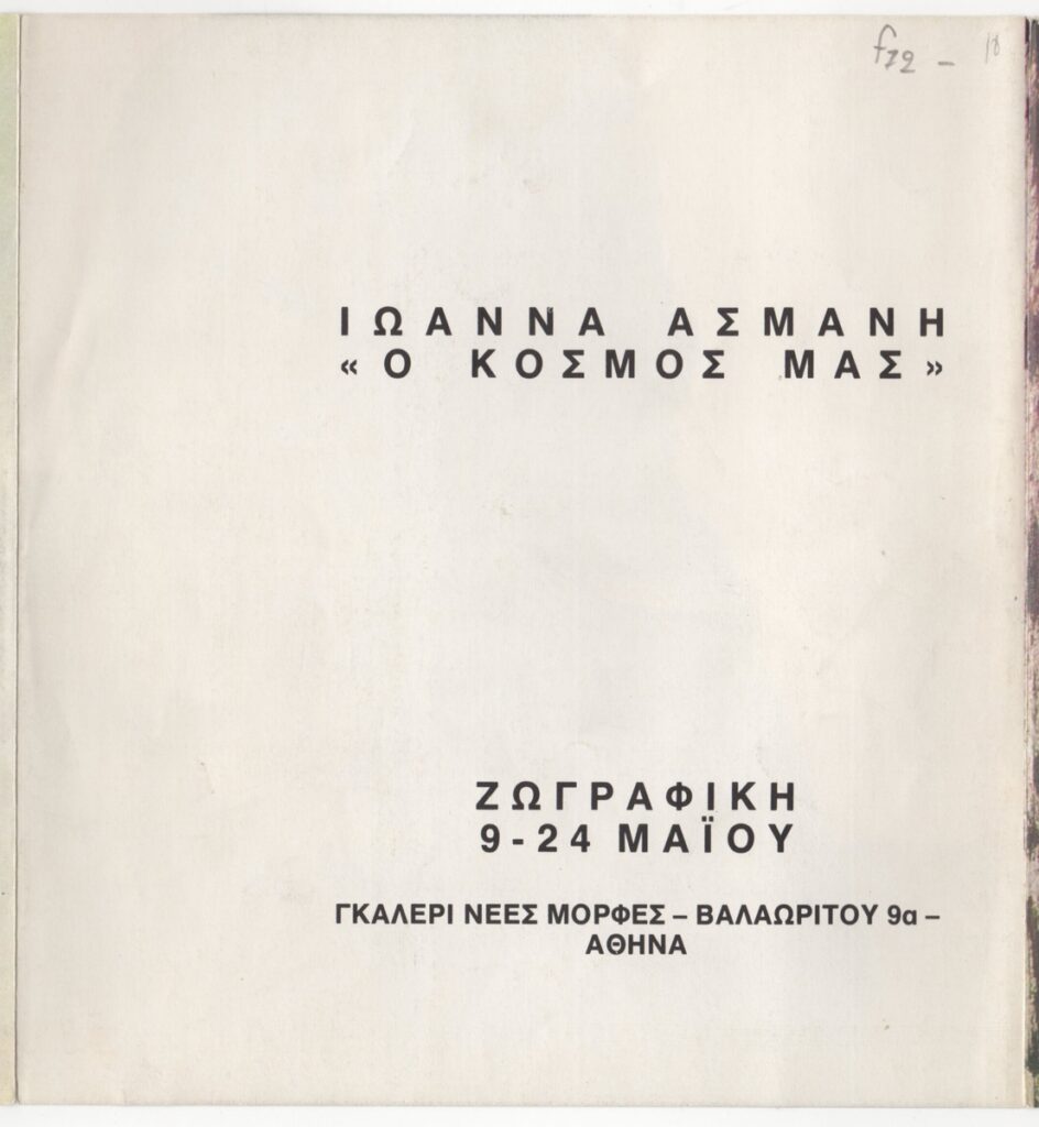 Έντυπο, τρίπτυχο, χαρτί, 19,5×18,0 εκ., στα ελληνικά. Φυλλάδιο της ατομικής έκθεσης έργων της Ιωάννας Ασμάνη στην Αθήνα το 1977. Περιέχει κείμενο της καλλιτέχνιδας και του τεχνοκριτικού Τ. Τσιρμπίνου. Εικονογραφείται με αναπαραγωγές έργων. Εσωτερική επιγραφή.