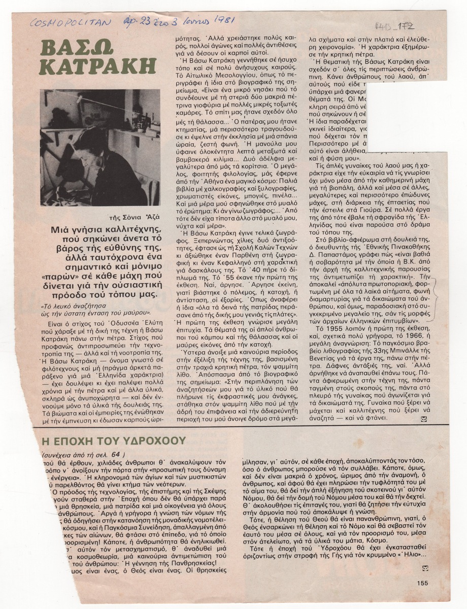 Απόκομμα του περιοδικού “Cosmopolitan” τεύχος 06/1981. Άρθρο της Σόνιας Αζά για το έργο της χαράκτριας Βάσως Κατράκη με αφορμή την αναδρομική έκθεση έργων της στην Εθνική Πινακοθήκη. Παρατίθενται στίχοι του Οδυσσέα Ελύτη.