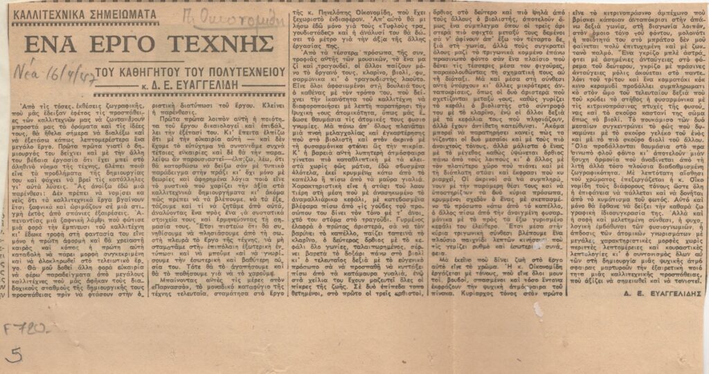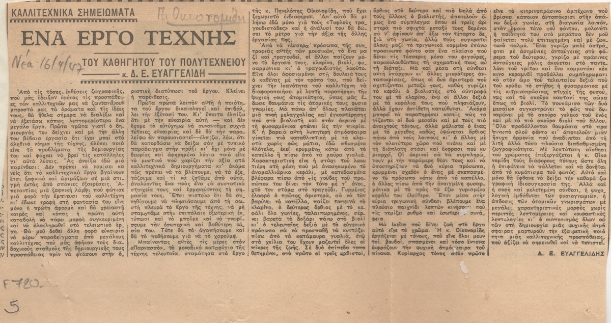 Απόκομμα, χαρτί, 13×24 εκ., κολλημένο σε ριζόχαρτο, στα ελληνικά, δημοσίευσης κριτικής έκθεσης της Πηνελόπης Οικονομίδη, η οποία διεξάγεται στον Φιλολογικό Σύλλογο Παρνασσό, στην Αθήνα.