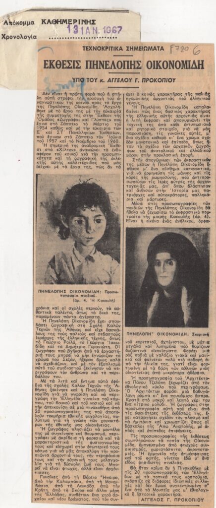 Απόκομμα, χαρτί, 28×10 εκ., στα ελληνικά, δημοσίευσης κριτικής έκθεσης της Πηνελόπης Οικονομίδη, η οποία διεξάγεται στην Αίθουσα Τέχνης Αθηνών Χίλτον.