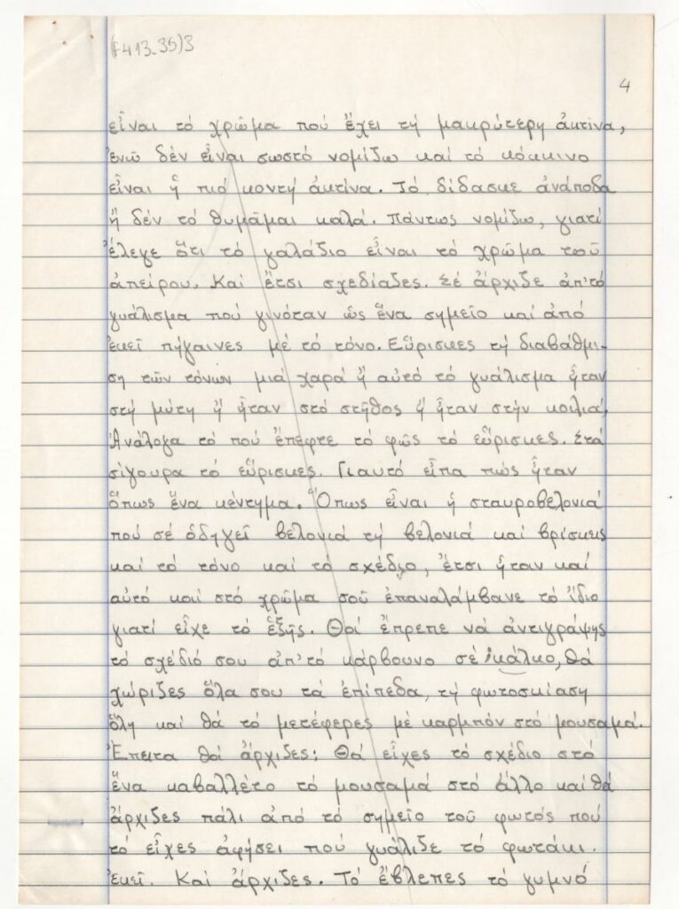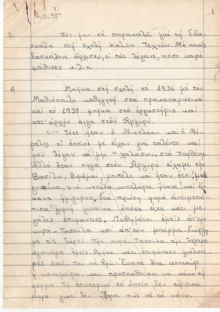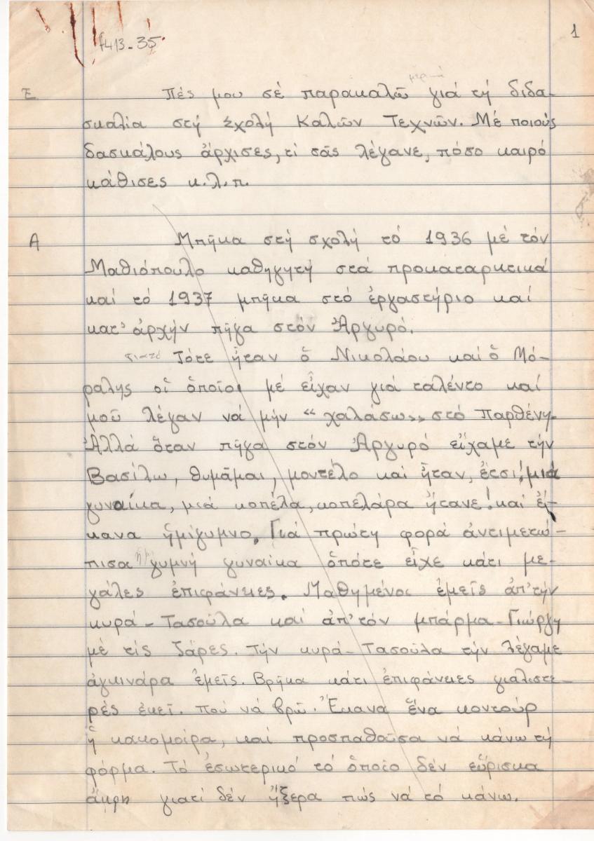 Χειρόγραφη απομαγνητοφώνηση συνέντευξης της Βάσως Κατράκη για τις σπουδές, τη δράση της το διάστημα του μεσοπολέμου και της Κατοχής και το έργο της.