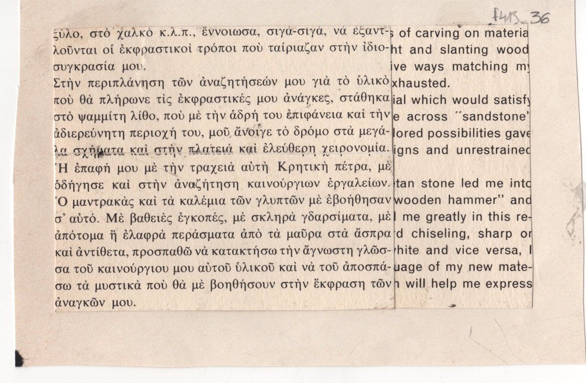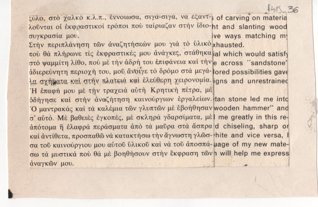 Απόκομμα εντύπου, στα ελληνικά και αγγλικά, χαρτόνι, 10,0×15,3 εκ. Απόσπασμα κειμένου της χαράκτριας Βάσως Κατράκη για την 33η Biennale της Βενετίας [1966]. Πρόκειται για δύο αποκόμματα με το ίδιο κείμενο, από κάτω στα αγγλικά και επικολημμένο από πάνω στα ελληνικά.