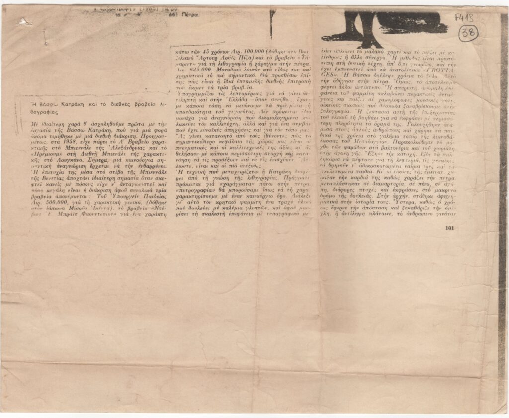 Φωτοαντίγραφο αποκομμάτων εντύπου, στα ελληνικά, χαρτί, 20,5×25,5 εκ. Δημοσιευμένο κείμενο του Τώνη Σπητέρη για το διεθνές βραβείο χαρακτικής που της αποδόθηκε στην Biennale της Βενετίας το 1966.