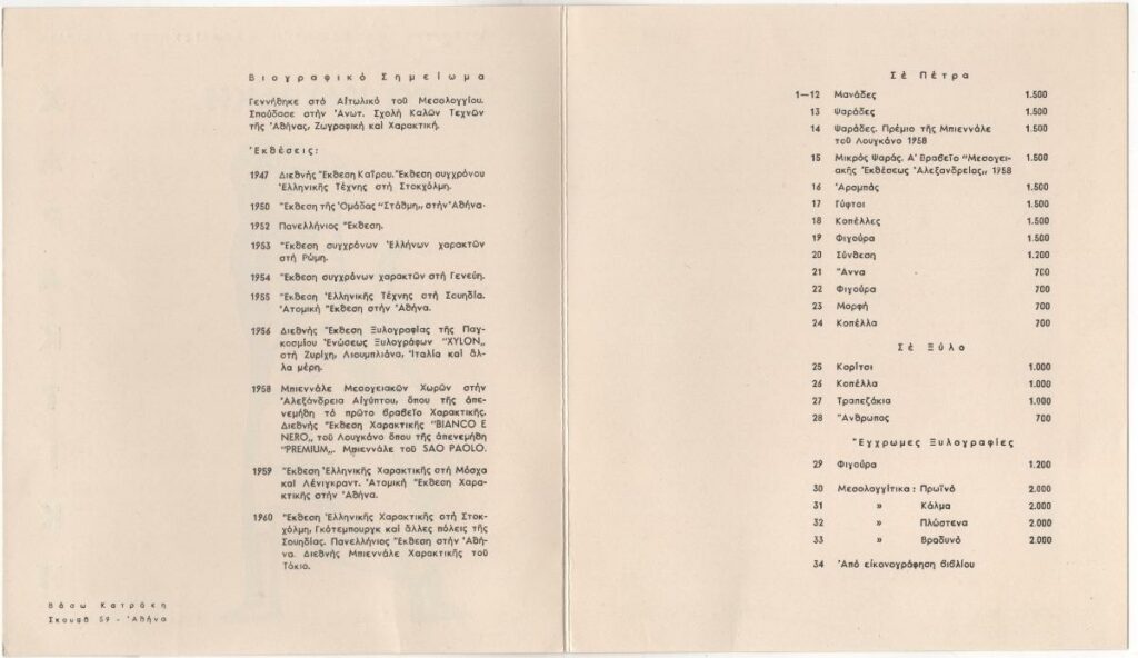 Έντυπο έκθεσης της ατομικής έκθεσης χαρακτικής της Βάσως Κατράκη στην “Τέχνη” Μακεδονική Καλλιτεχνική Εταιρεία στη Θεσσαλονίκη. Περιέχει σύντομο βιογραφικό της καλλιτέχνιδας και τιμοκατάλογο έργων.