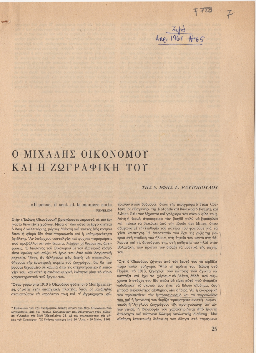 Απόκομμα, χαρτί διπλής όψης, 3 φφ, 28×21 εκ., στα ελληνικά, δημοσίευσης άρθρου για τη ζωή και την καλλιτεχνική δραστηριότητα του Μιχάλη Οικονόμου.