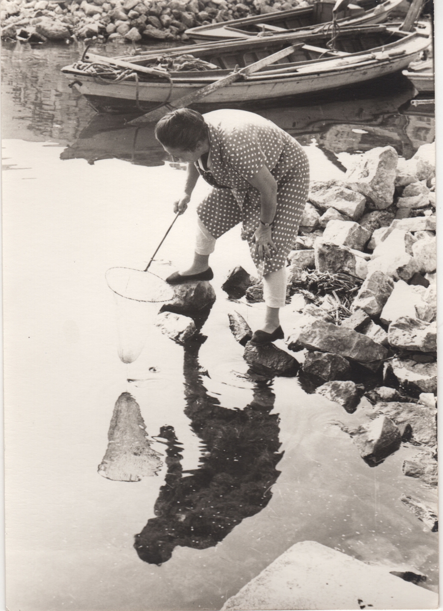 Φωτογραφία, α/μ, σε φωτογραφικό χαρτί, 14,7×10,4 εκ. Η Βάσω Κατράκη στην ακροθαλασσιά.