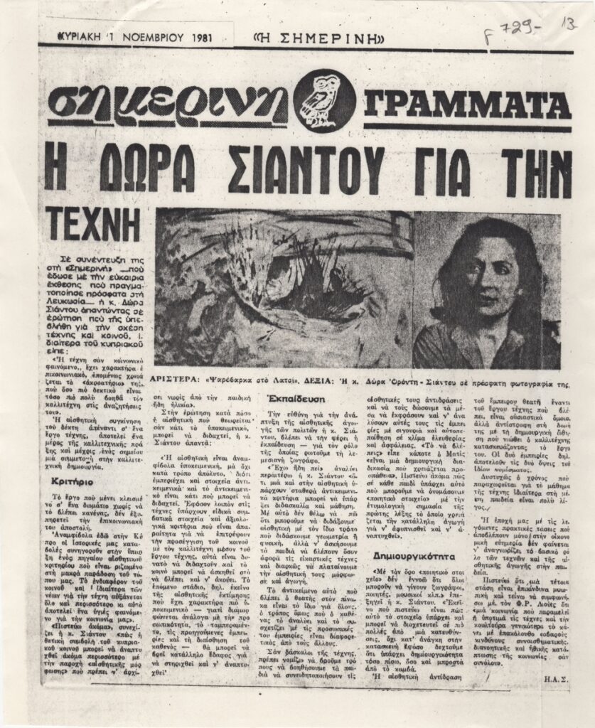 Φωτοαντίγραφο, χαρτί, 29,5×24,5 εκ., στα ελληνικά, δημοσίευσης συνέντευξης της Δώρας Σιάντου στον/στην Η.Α.Σ., αναφορικά με την σχέση κοινού και Τέχνης στην Κύπρο. Η συνέντευξη έγινε στο πλαίσιο έκθεσης της καλλιτέχνιδας στη Λευκωσία.