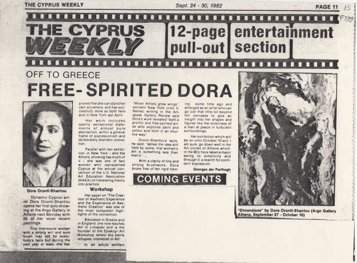 Φωτοαντίγραφο, χαρτί, 24×29 εκ., στα αγγλικά, δημοσίευσης κριτικής για το εικαστικό έργο της Δώρας Ορόντη, με αφορμή έκθεσή της στην Γκαλερί Αργώ στην Αθήνα.
