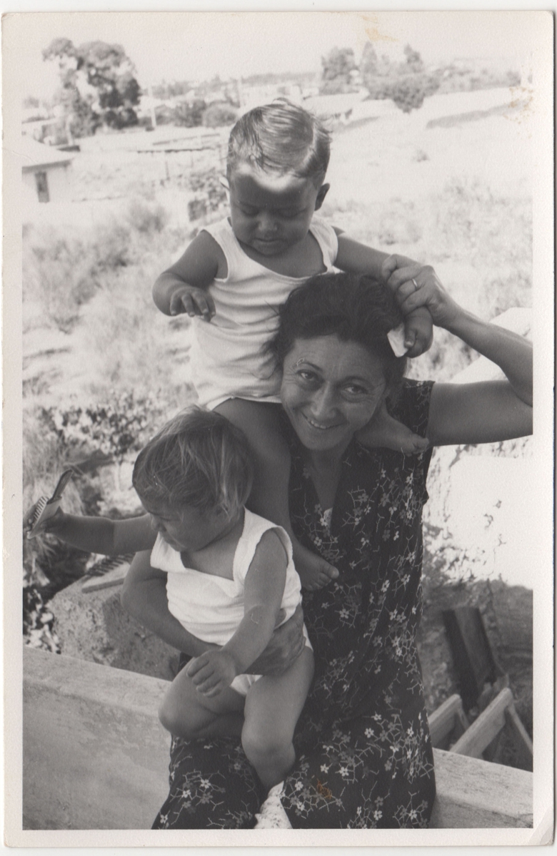 Φωτογραφία, α/μ, σε φωτογραφικό χαρτί, 14,6×9,7 εκ. Η Βάσω Κατράκη με τα παιδιά της στο Ξυλόκαστρο. Στην πίσω όψη επιγραφή.