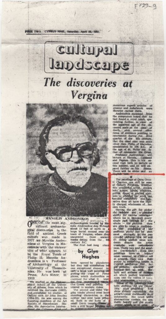 Φωτοαντίγραφο, χαρτί, 34×18 εκ., στα αγγλικά, δημοσίευσης άρθρου αναφερόμενου στην ανακάλυψη του βασιλιά Φίλιππου της Μακεδονίας στη Βεργίνα, από τον Μανόλη Ανδρόνικο, . Δίνονται πληροφορίες για τη δραστηριότητα του Μανόλη Ανδρόνικου.