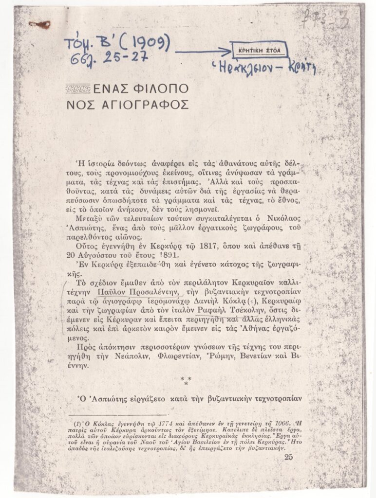 Φωτοαντίγραφο αποκομμάτων εντύπου, χαρτί, 3 φφ, 18,0×12,3 εκ., όπου δημοσιεύεται, στα ελληνικά, κείμενο για τον καλλιτέχνη. Στο τρίτο φύλλο δημοσιεύεται επίσης το ποίημα του Πέτρου Καντανολέου “Καϋμός και πόθος”. Στο πρώτο και το τρίτο φύλλο επιγραφές.
