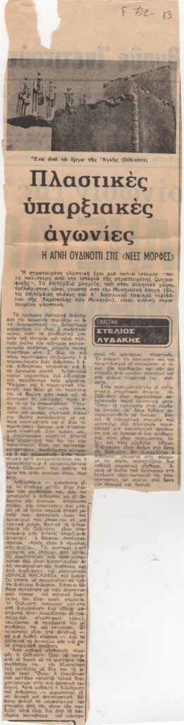Απόκομμα, χαρτί 49×10,5 εκ., στα ελληνικά, δημοσίευσης κριτικής έκθεσης της Αγνής Ουδινόττι, η οποία διεξάγεται στην Γκαλερί Νέες Μορφές στην Αθήνα.