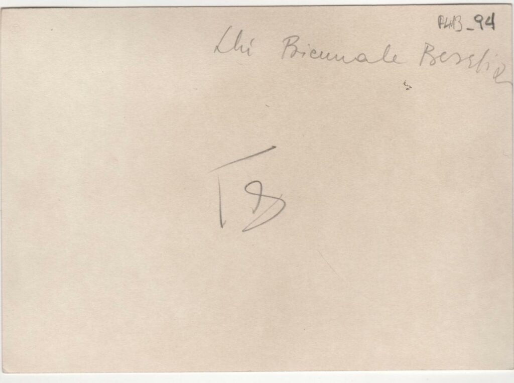 Ασπρόμαυρη εκτυπωμένη φωτογραφία της Βάσως Κατράκη σε υπαίθρια έκθεση στην Biennale της Βενετίας το 1966 (;). Στην πίσω όψη επιγραφή.