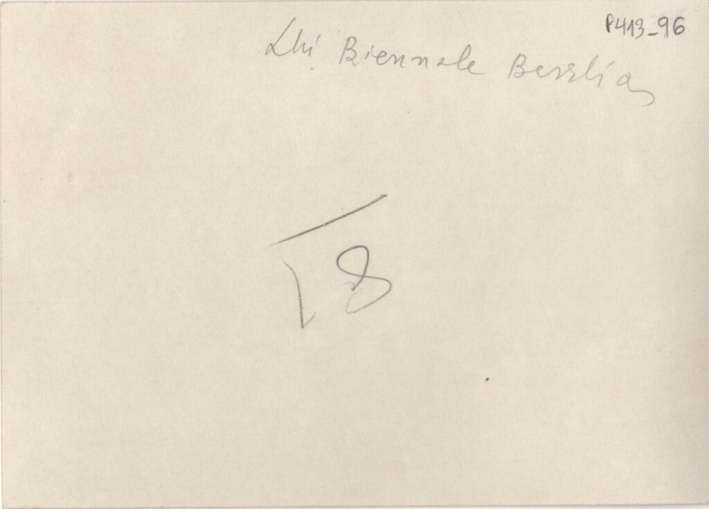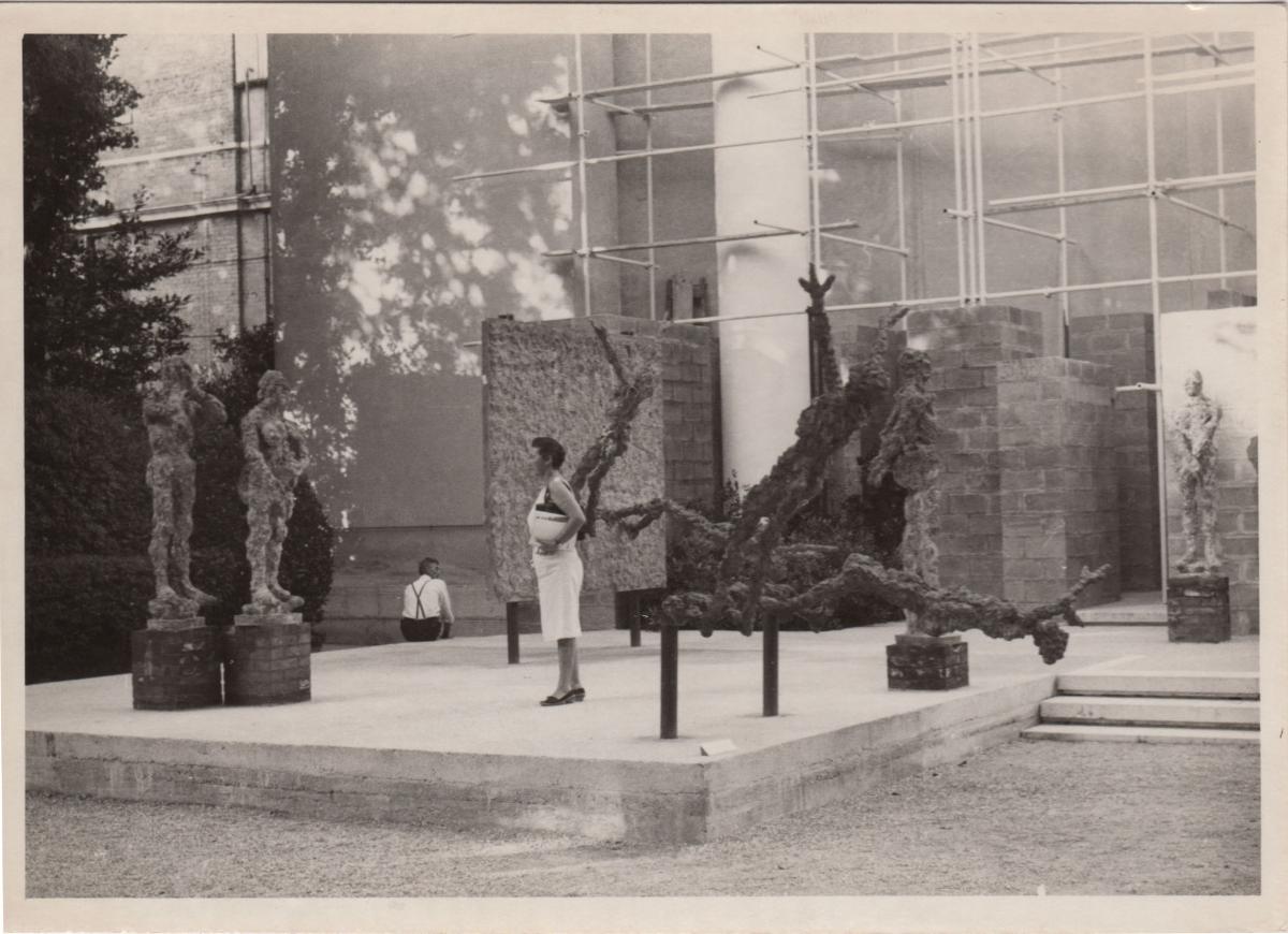 Ασπρόμαυρη εκτυπωμένη φωτογραφία της Βάσως Κατράκη σε υπαίθρια έκθεση στην Biennale της Βενετίας. Στην πίσω όψη επιγραφή.