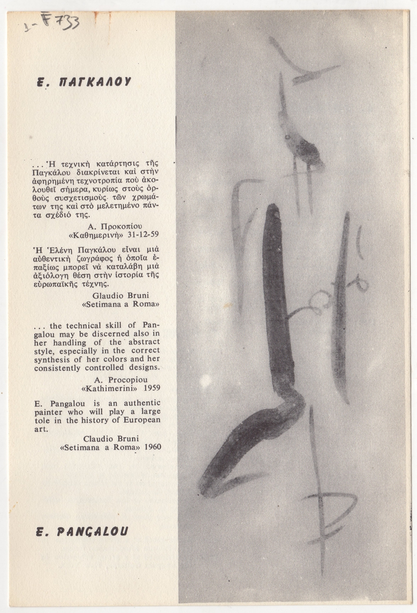 Έντυπο, χαρτόνι διπλής όψης, 21,5×14,5 εκ., στα ελληνικά και αγγλικά, με βιογραφικό σημείωμα και κριτικές για το έργο της Ελένης Παγκάλου.