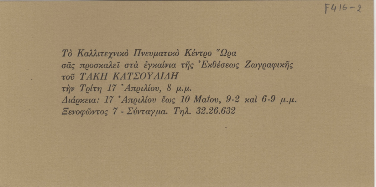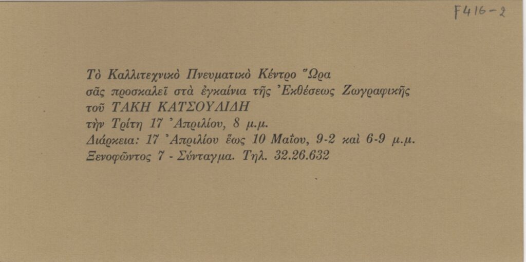 Πρόσκληση, χαρτί, 8,5×17 εκ., στα ελληνικά, εγκαινίων ατομικής έκθεσης ζωγραφικής του Τάκη Κατσουλίδη.