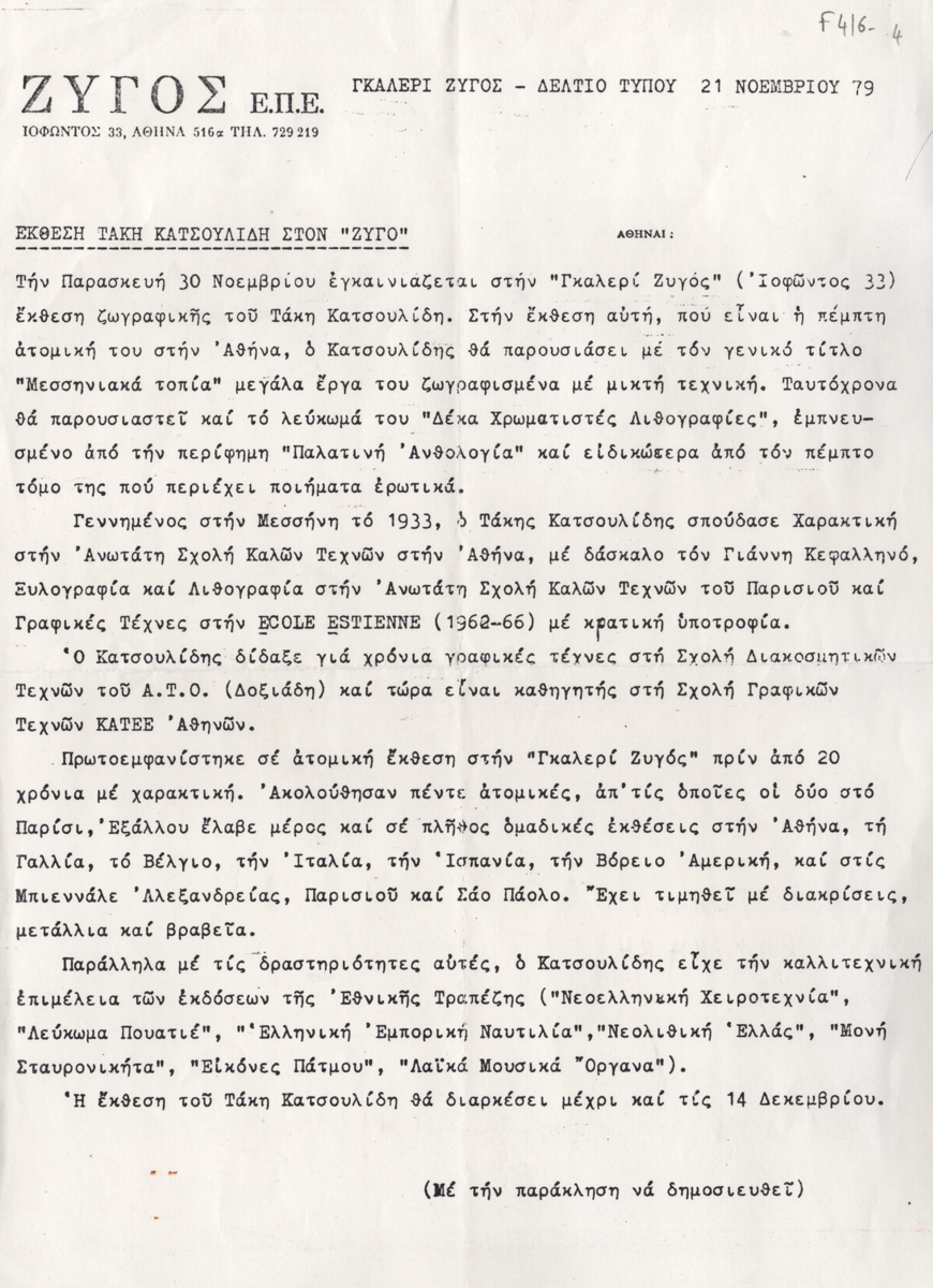 Φωτοαντίγραφο δελτίου Τύπου, δακτυλόγραφο, χαρτί, 29,5×21 εκ., στα ελληνικά, ατομικής έκθεσης ζωγραφικής του Τάκη Κατσουλίδη. Περιέχει βιογραφικές πληροφορίες και στοιχεία για το έργο που θα παρουσιαστεί.
