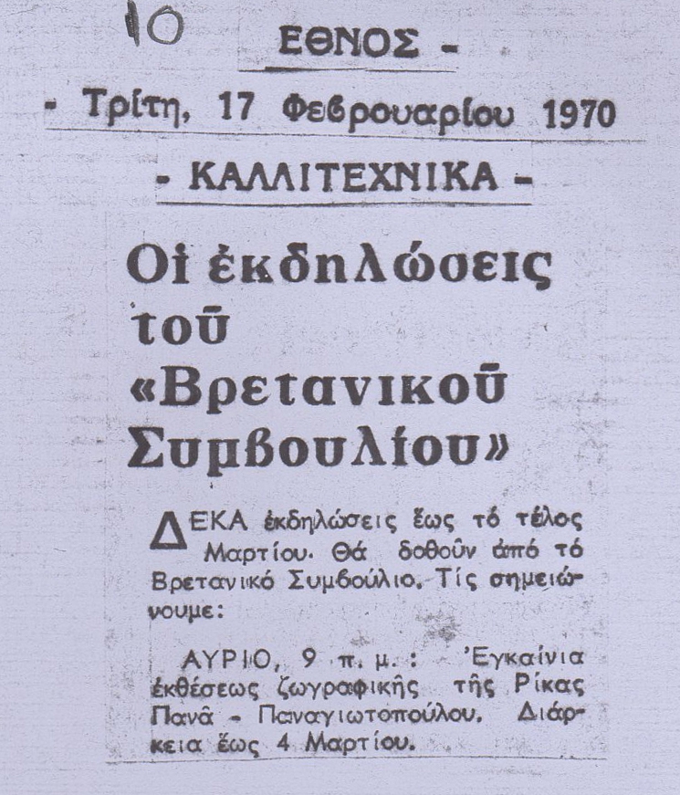Φωτοαντίγραφο, χαρτί, 29.5×21 εκ., στα ελληνικά, δημοσίευσης άρθρου αναφερόμενου στα εγκαίνια έκθεσης της Ρίκας Πανά στο Βρετανικό Συμβούλιο Αθηνών.