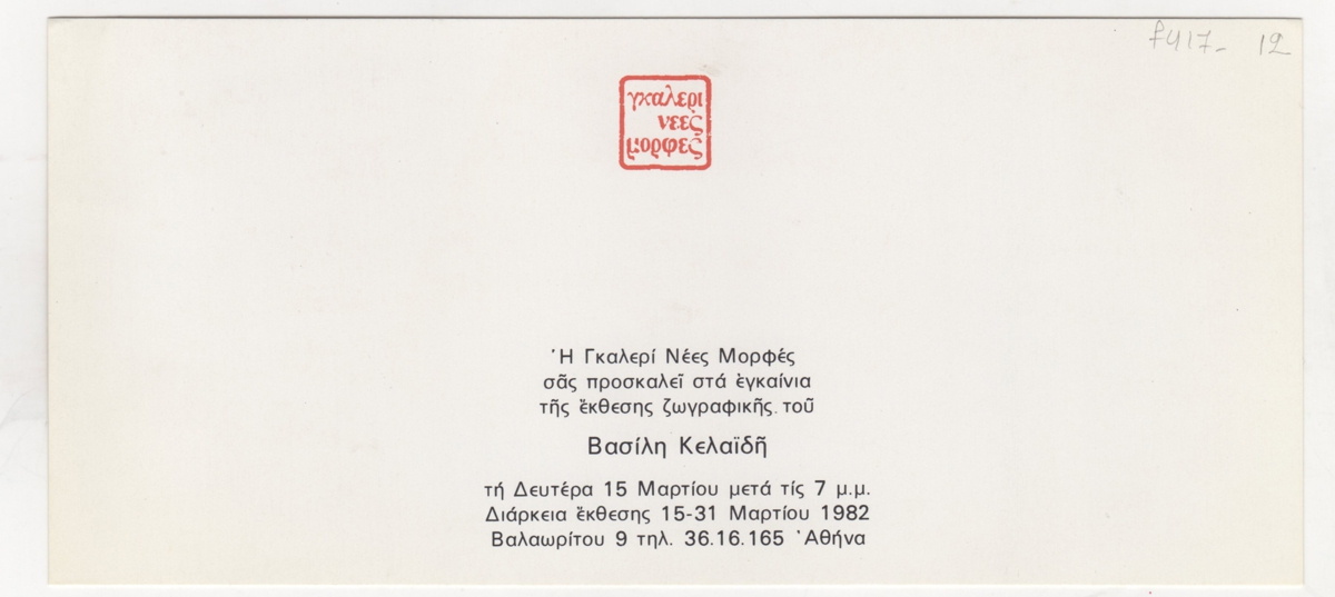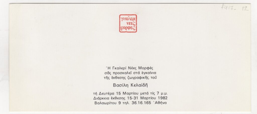 Πρόσκληση, χαρτί ιλλουστρασιόν, 9,5×21 εκ., στα ελληνικά, εγκαινίων ατομικής έκθεσης ζωγραφικής του Βασίλη Κελαϊδή.