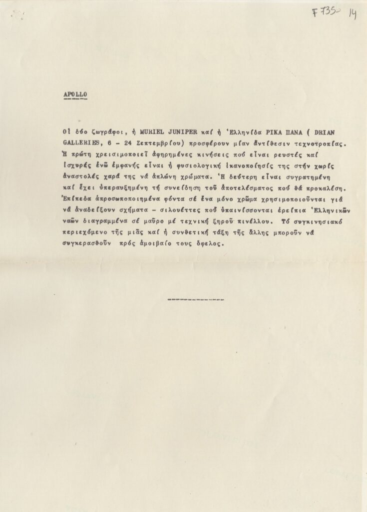 Αποδελτίωση, δακτυλόγραφο, χαρτί, 29,5×21 εκ., στα ελληνικά, δημοσίευσης κριτικής εκθέσεων των Muriel Juniper και Ρίκα Πανά στο Λονδίνο.