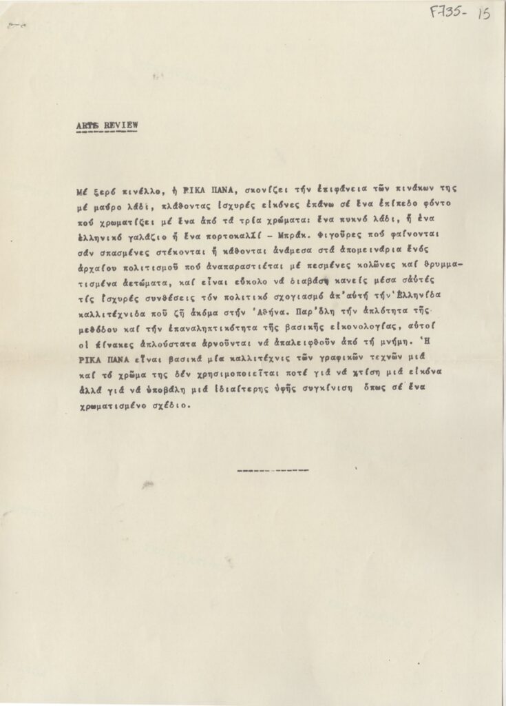 Αποδελτίωση, δακτυλόγραφο, χαρτί, 29.5×21 εκ., στα ελληνικά, δημοσίευσης κριτικής έκθεσης της Ρίκας Πανά.