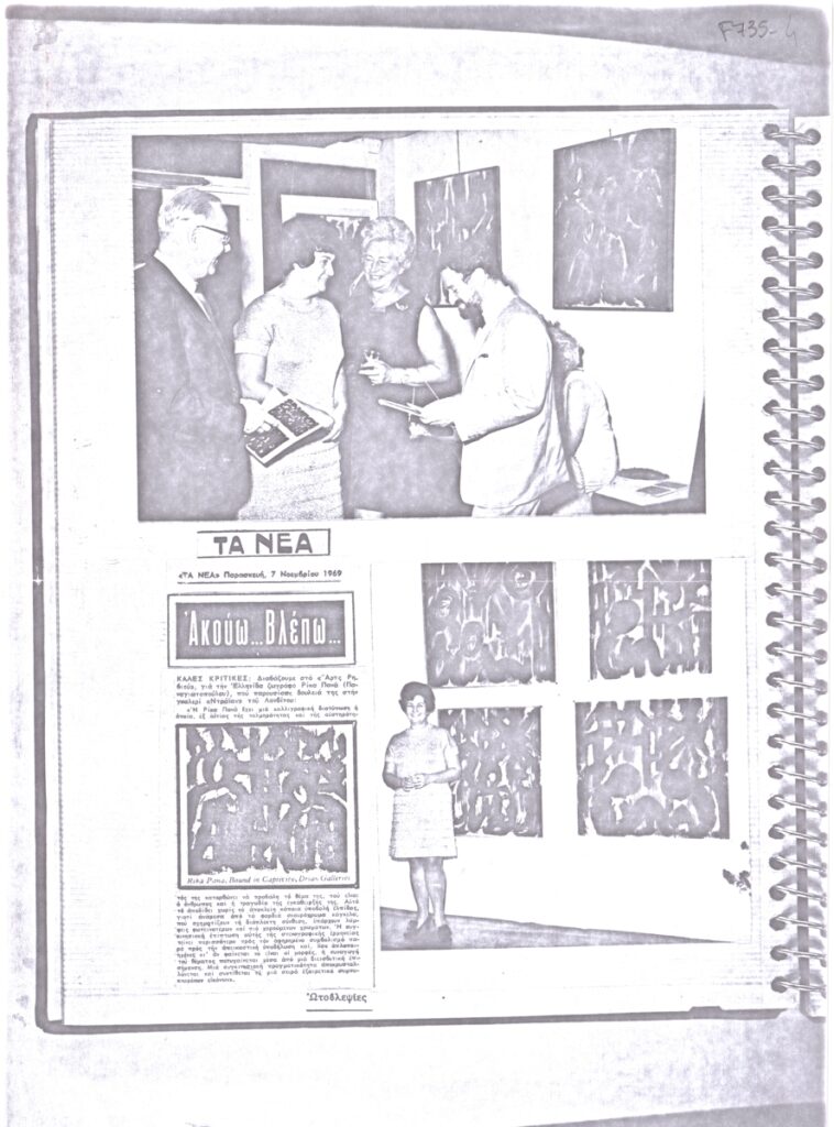 Φωτοαντίγραφο, χαρτί, 30×21 εκ., στα ελληνικά, δημοσίευσης άρθρου αναφερόμενου σε κριτική εντύπου του διεθνούς Τύπου, για το έργο που παρουσίασε η Ρίκα Πανά, σε έκθεσή της στο Λονδίνο.