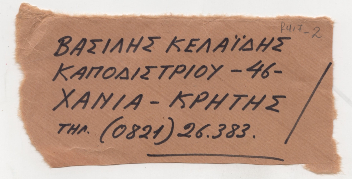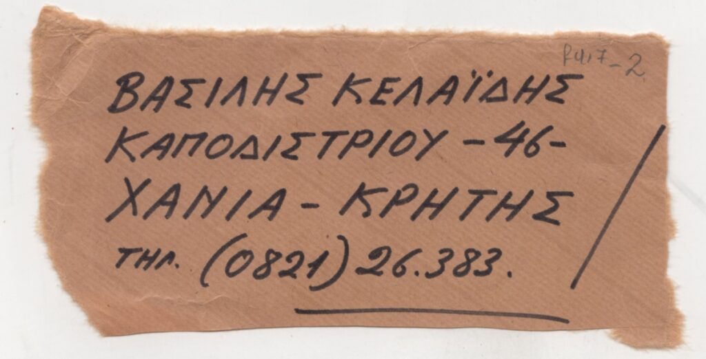 Απόκομμα ταχυδρομικού φακέλου, χαρτί, 6×13 εκ., στα ελληνικά, με χειρόγραφη επιγραφή (ταχυδρομική διεύθυνση του Βασίλη Κελαϊδή).