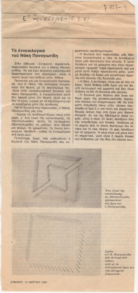 Απόκομμα, χαρτί, 29×14 εκ., στα ελληνικά, δημοσίευσης κριτικής έκθεσης του Νάκη Παναγιωτίδη, η οποία διεξάγεται στην Αθήνα.
