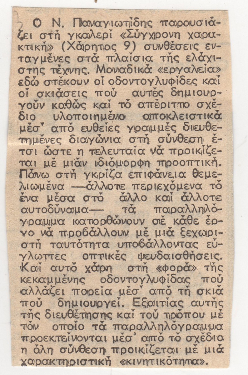 Απόκομμα, χαρτί, 8×5,5 εκ., στα ελληνικά, δημοσίευσης κριτικής έκθεσης του Νάκη Παναγιωτίδη, η οποία διεξάγεται στην Γκαλερί Σύγχρονη Χαρακτική στην Αθήνα.