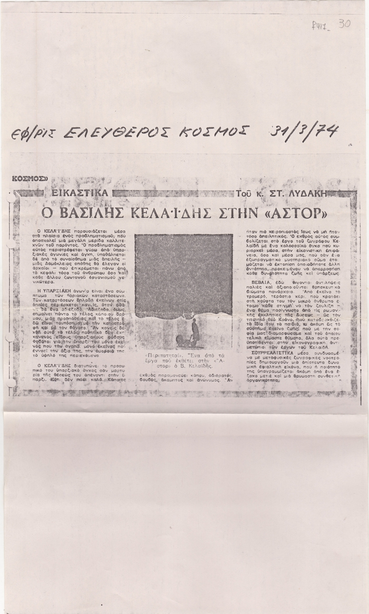Φωτοαντίγραφο, χαρτί, 35,5×21 εκ., στα ελληνικά, δημοσίευσης κριτικής έκθεσης του Βασίλη Κελαϊδή, η οποία διεξάγεται στην Γκαλερί Άστορ, στην Αθήνα. Εντάσσεται στη στήλη “Εικαστικά” του εντύπου.
