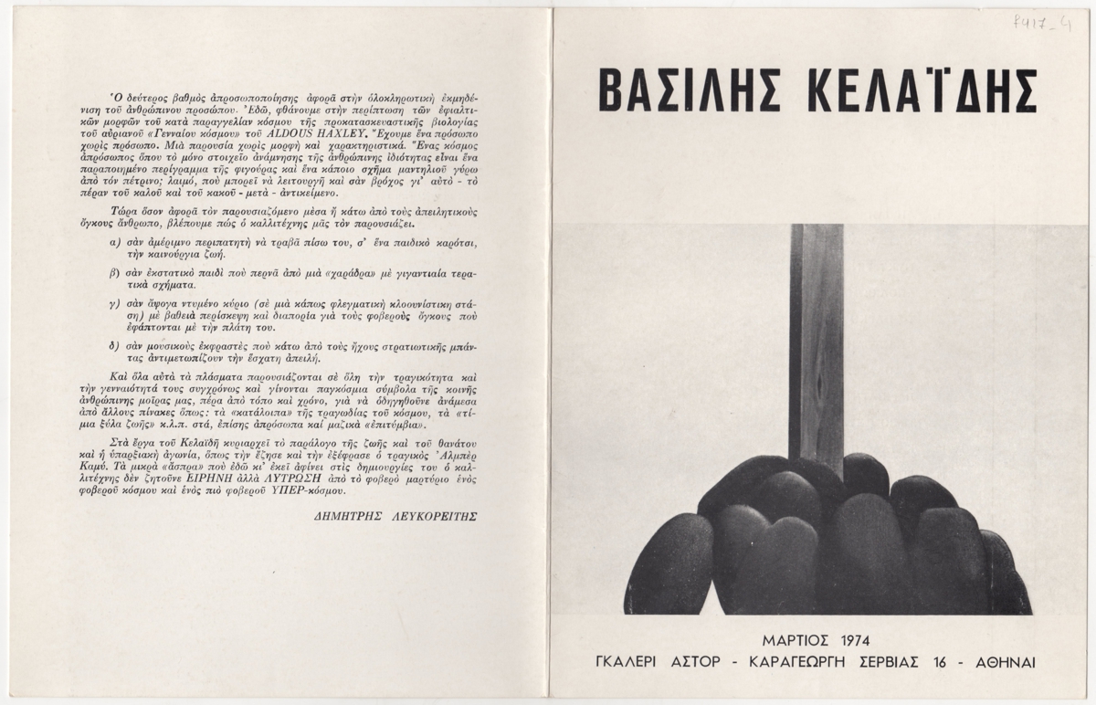 Έντυπο, χαρτόνι αναδιπλωμένο, 22×17 εκ., στα ελληνικά, ατομικής έκθεσης ζωγραφικής του Βασίλη Κελαϊδή. Περιέχει λίστα των εκτιθέμενων έργων, βιογραφικό σημείωμα και κείμενο για το έργο του.