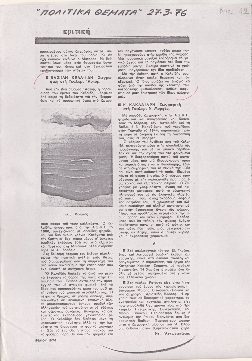 Φωτοαντίγραφο, χαρτί, 30×21 εκ., στα ελληνικά, δημοσίευσης κριτικής για τις ατομικές εκθέσεις των Βασίλη Κελαϊδή και Νίκου Κακαδιάρη στις γκαλερί Άστορ και Νέες Μορφές αντίστοιχα. Επίσης, γίνεται λόγος για εκδήλωση με προβολή διαφανειών έργων της Κατερίνας Χαριάτη-Σισμάνη, Μαίρης Βιτωράτου-Ράικου και Αριστείδη Βλάσση.