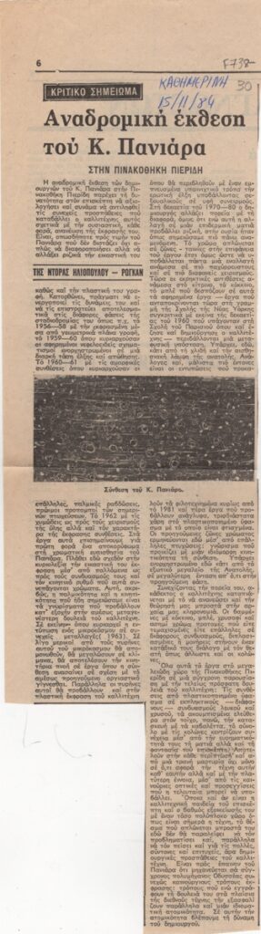 Απόκομμα, χαρτί, 42×11,5 εκ., στα ελληνικά, δημοσίευσης κριτικής έκθεσης του Κώστα Πανιάρα, η οποία διεξάγεται στην Πινακοθήκη Πιερίδη.