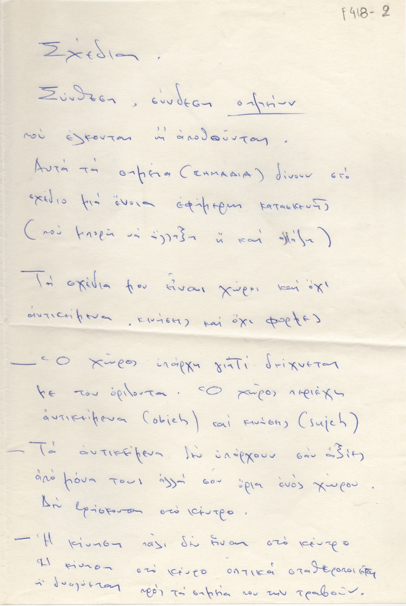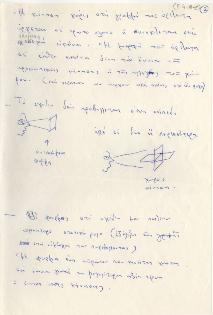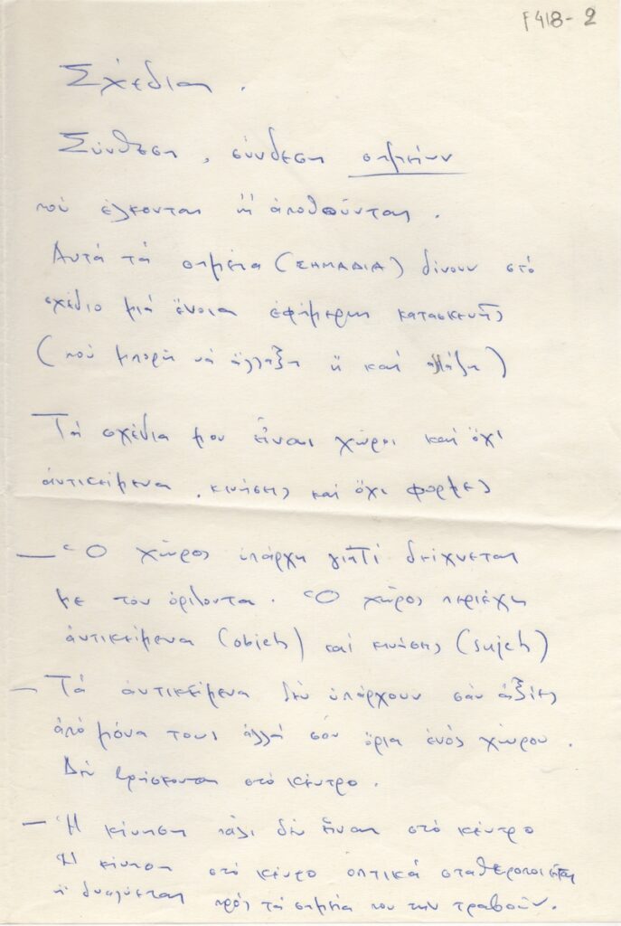 Κείμενο, χειρόγραφο, χαρτί, 2 φφ, 28,5×19 εκ., στα ελληνικά, του Άγη Κελπέκη για το έργο του. Aναφέρεται στις φόρμες σχεδίων του.