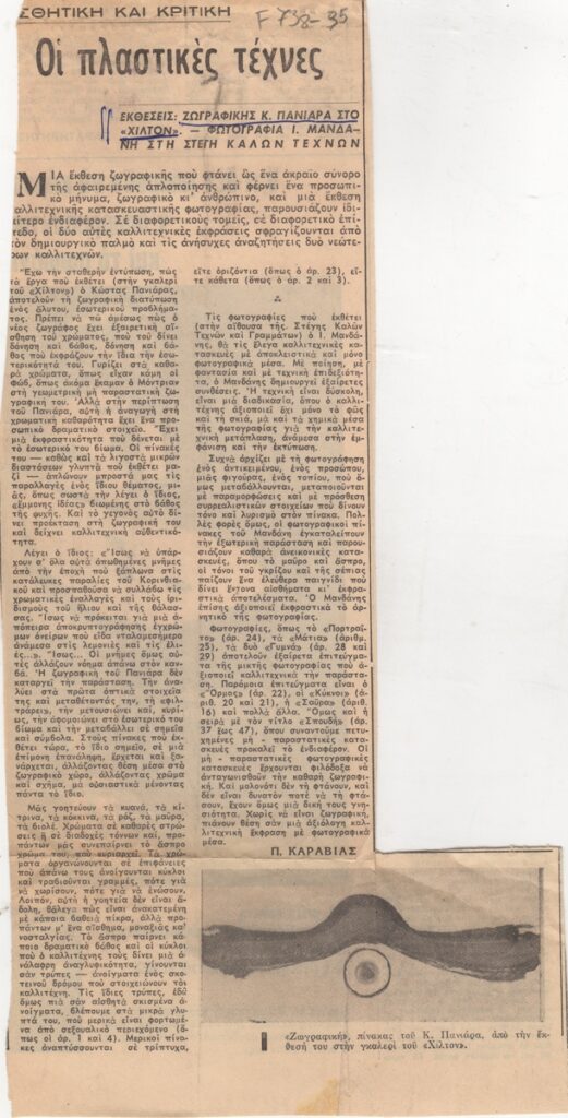 Απόκομμα, χαρτί, 30×15 εκ., στα ελληνικά, δημοσίευσης κριτικής εκθέσεων των Κώστα Πανιάρα και Ι. Μανδάνη στην Αθήνα.
