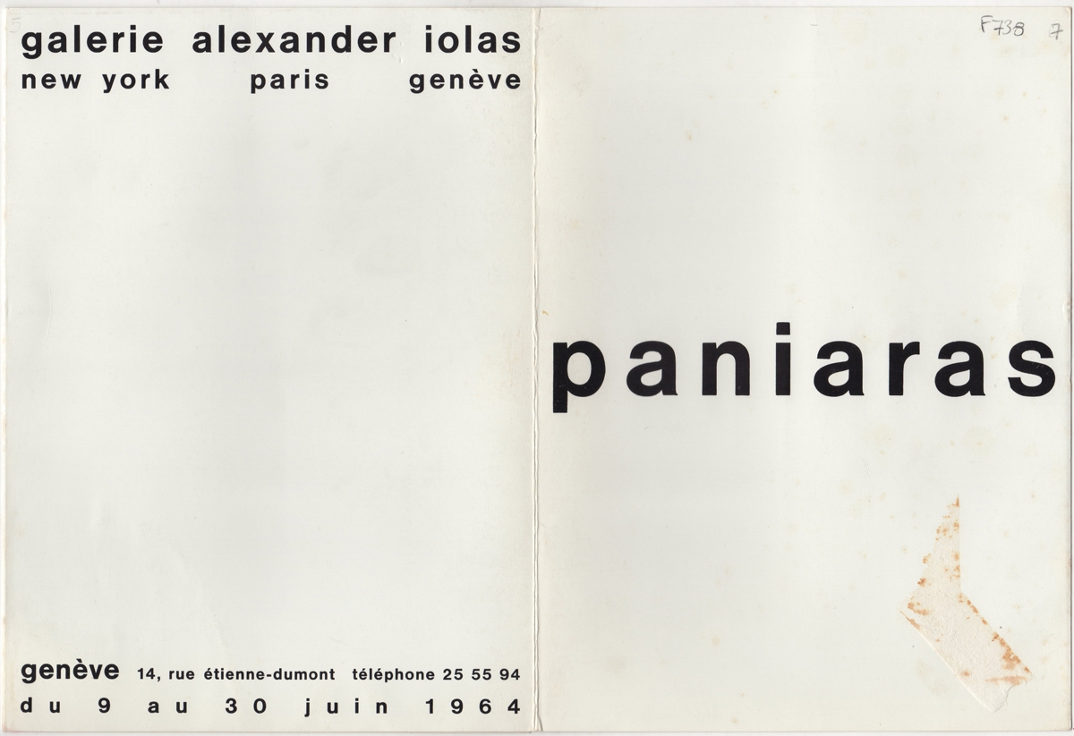 Έντυπο, χαρτόνι ιλλουστρασιόν δίπτυχο, 21,5×15 εκ., στα γαλλικά, ατομικής έκθεσης ζωγραφικής του Κώστα Πανιάρα. Περιέχει βιογραφικό σημείωμα, κατάλογο έργων, κείμενο/ κριτική για το έργο που παρουσιάζεται και εικονογράφηση.