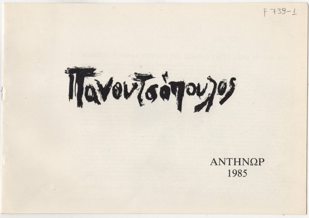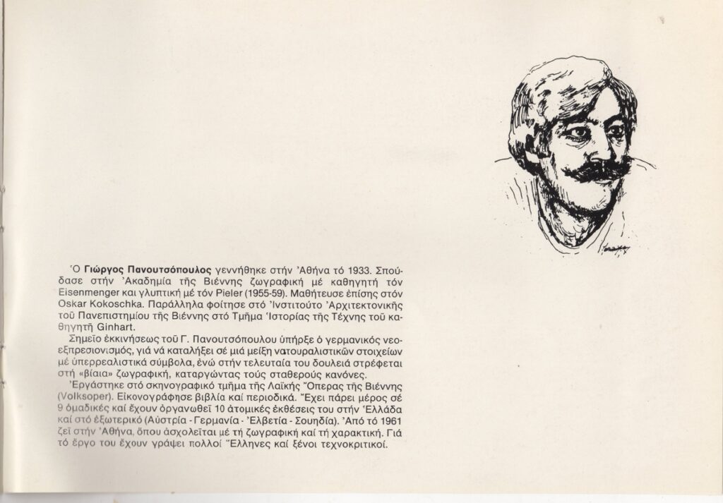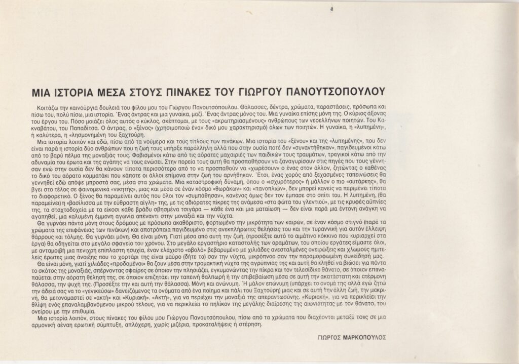 Έντυπο, χαρτί, 4 φφ, 17×24,5 εκ., στα ελληνικά, ατομικής έκθεσης ζωγραφικής του Γιώργου Πανουτσόπουλου. Περιέχει κείμενο του Γιώργου Μαρκόπουλου με τίτλο “Μια ιστορία μέσα στους πίνακες του Γιώργου Πανουτσόπουλου”, βιογραφικό του καλλιτέχνη και εικονογράφηση.