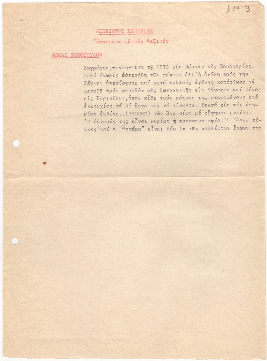 Κείμενο, δακτυλόγραφο, χαρτί, 29,2×21,5 εκ., στα ελληνικά. Αποδελτίωση εγκυκλοπαιδικού λήμματος για την εικαστικό Κλεονίκη Ασπριώτη.