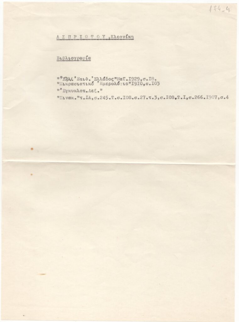Κείμενο, δακτυλόγραφο, χαρτί, 28,8×21,0 εκ., στα ελληνικά. Κατάλογος βιβλιογραφικών παραπομπών για την εικαστικό Κλεονίκη Ασπριώτη.