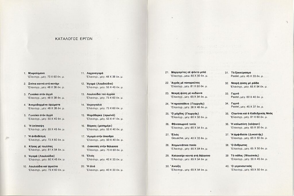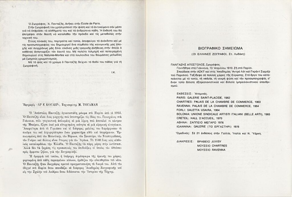 Έντυπο, χαρτόνι δίπτυχο, 23,5×17 εκ., στα ελληνικά, ατομικής έκθεσης ζωγραφικής του Απόστολου Πανταζή. Περιέχει βιογραφικό σημείωμα, κριτικές και κατάλογο έργων.