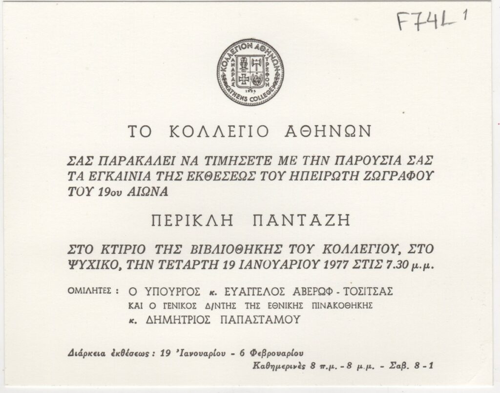Πρόσκληση, χαρτόνι, 11,5×14,5 εκ., στα ελληνικά, εγκαινίων έκθεσης ζωγραφικής του Περικλή Πανταζή. Σημειώνεται η ομιλία των Ευάγγελου Αβέρωφ και Δημήτριου Παπαστάμου.