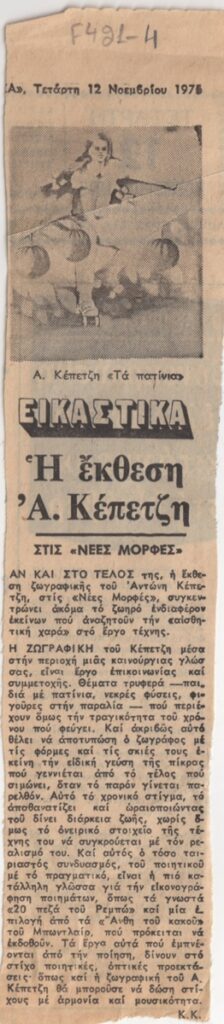 Απόκομμα, χαρτί, 23,5×5 εκ., στα ελληνικά, δημοσίευσης κριτικής έκθεσης του Αντώνη Κεπέτζη, η οποία διεξάγεται στην γκαλερί Νέες Μορφές.