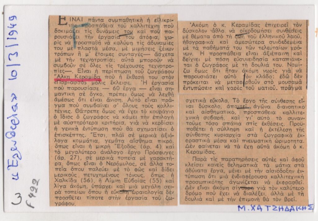 Απόκομμα, χαρτί συρραμμένο σε έντυπο, 10×15 εκ., στα ελληνικά, δημοσίευσης κριτικής έκθεσης του Άλκη Κεραμίδα, η οποία διεξάγεται στον Φιλολογικό Σύλλογο Παρνασσό.