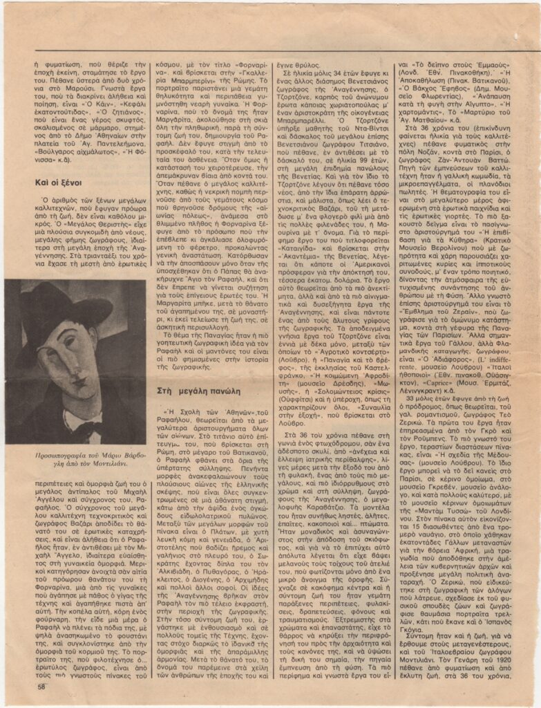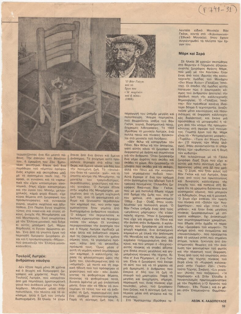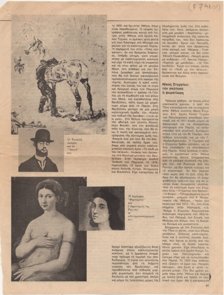 Απόκομμα, χαρτί, 3 φφ, 30×23 εκ., στα ελληνικά, δημοσίευσης κειμένου-αφιερώματος σε Έλληνες και ξένους καλλιτέχνες οι οποίοι πέθαναν νέοι. Ειδικότερα αναφέρονται οι: Νίκος Στεργίου, Περικλής Πανταζής, Lautrec, Van Gogh, A. Modigliani, Raphael, Fr. Mark και Georges Sera.