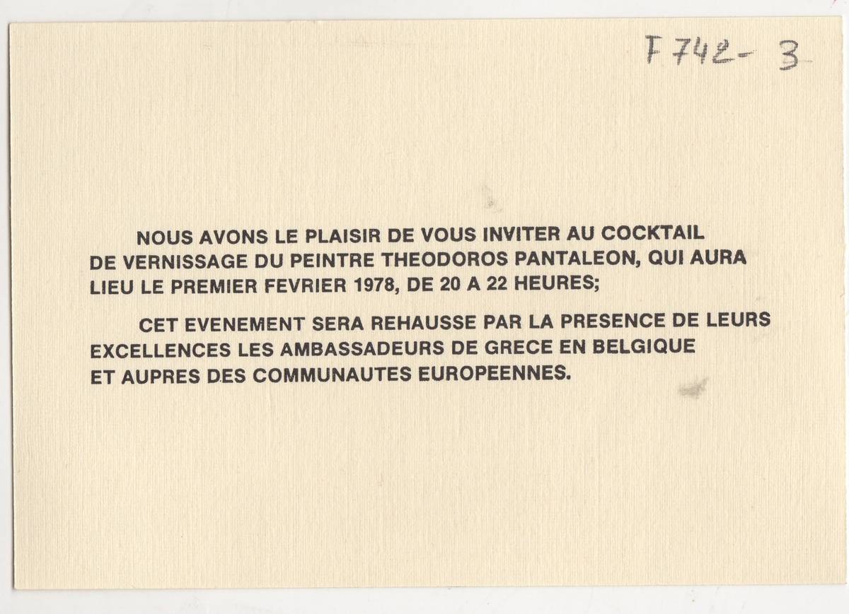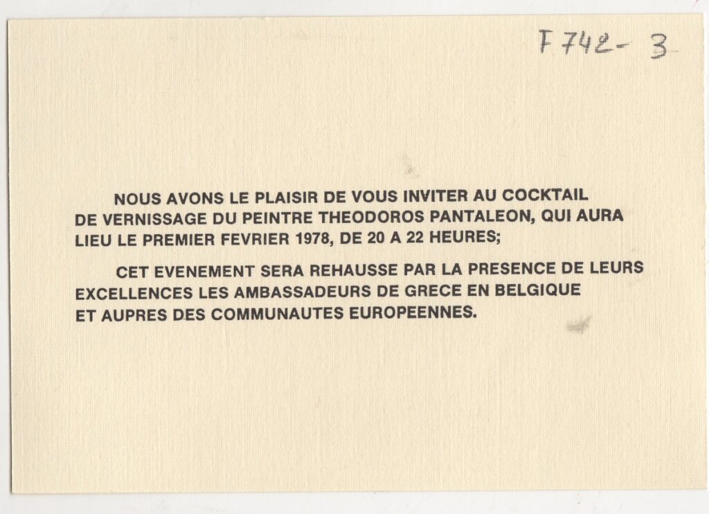 Πρόσκληση, χαρτόνι, 9,5×14 εκ., στα γαλλικά, σε κοκτέιλ κατά τη διάρκεια των εγκαινίων ατομικής έκθεσης ζωγραφικής του Θόδωρου Πανταλέων στις Βρυξέλλες. Σημειώνεται η παρουσία του Έλληνα πρέσβη στις Βρυξέλλες.