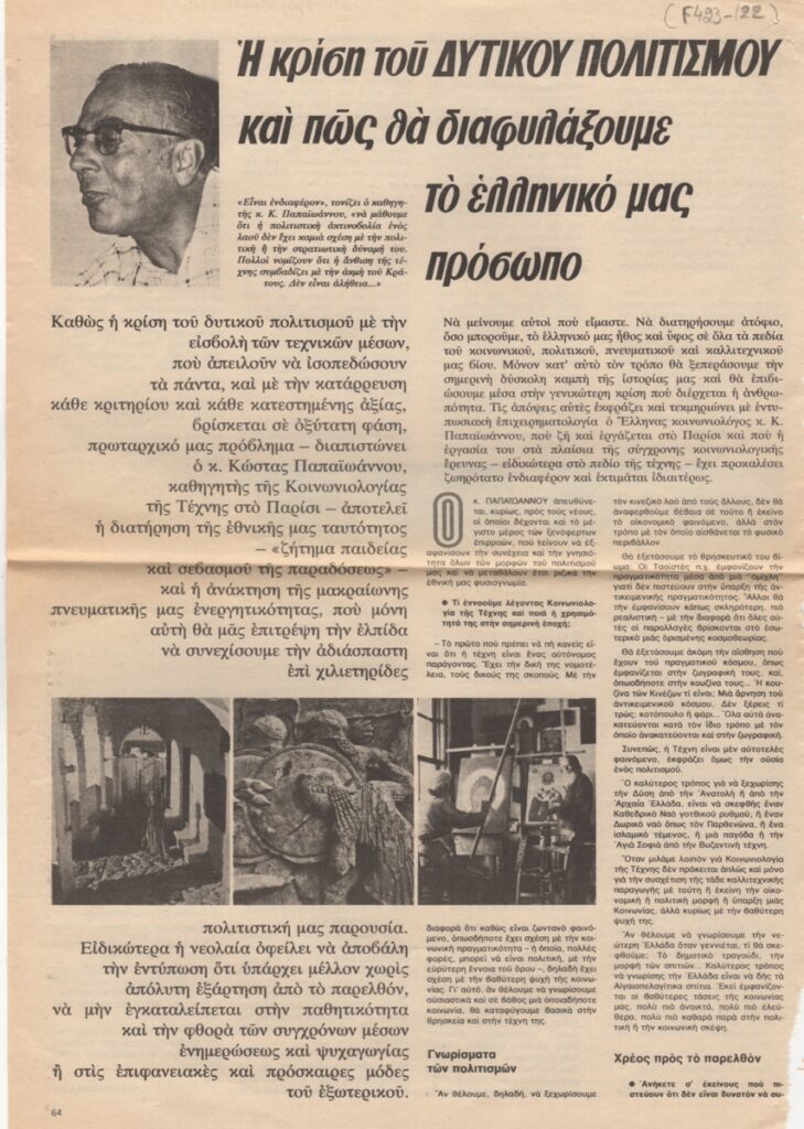 Στο κείμενο αναφέρονται κριτικές που έχουν γίνει για το έργο του καλλιτέχνη. Στην πίσω όψη, απόκομμα άρθρου με τίτλο “Η κρίση του Δυτικού πολιτισμού και πώς θα διαφυλάξουμε το ελληνικό μας πρόσωπο”.