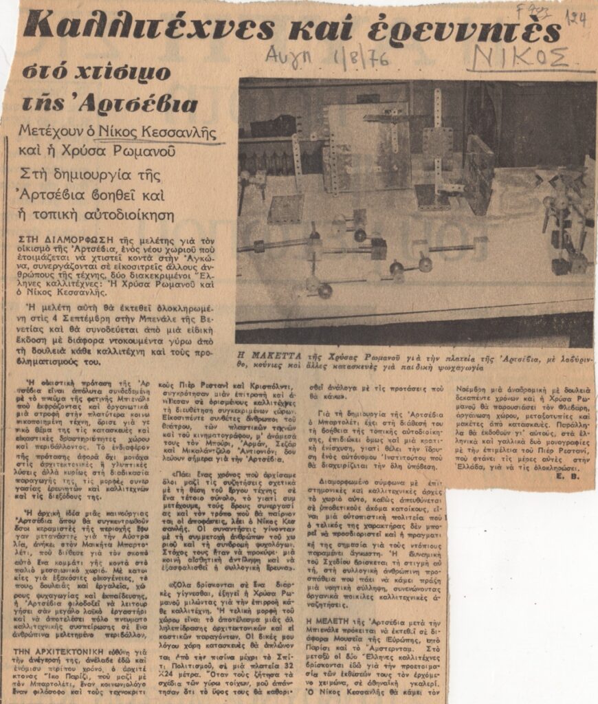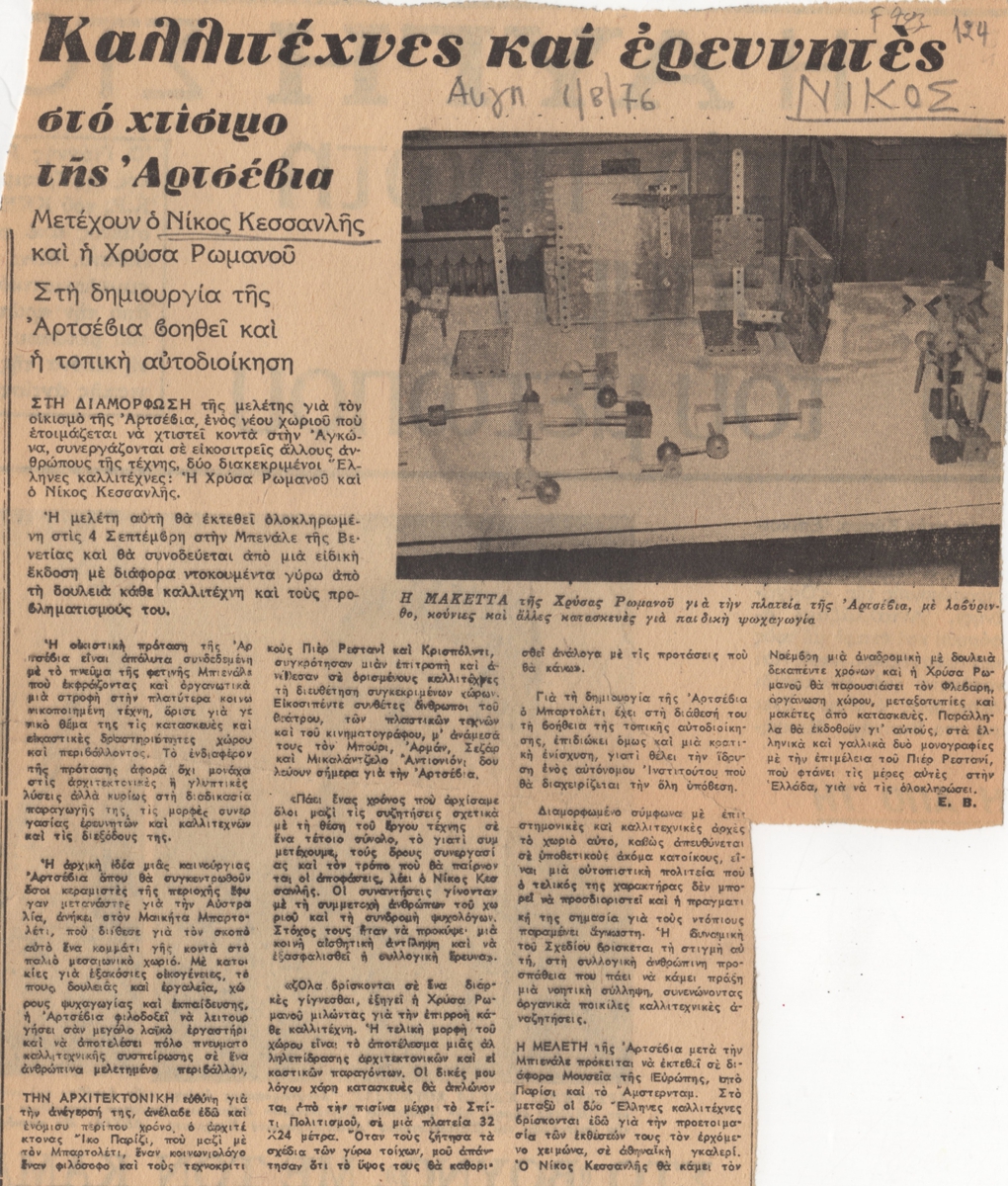 Απόκομμα, χαρτί, 24.5×20.5 εκ., στα ελληνικά, δημοσίευσης άρθρου που αναφέρεται στην ανακατασκευή του χωριού Αρτσέβια από ομάδα καλλιτεχνών ανάμεσα στους οποίους οι Νίκος Κεσσανλής και Χρύσα Ρωμανού. Στο κείμενο δίνονται πληροφορίες για το έργο και τη μελέτη του που επρόκειτο να παρουσιασθεί στην Μπιενάλε Βενετίας.